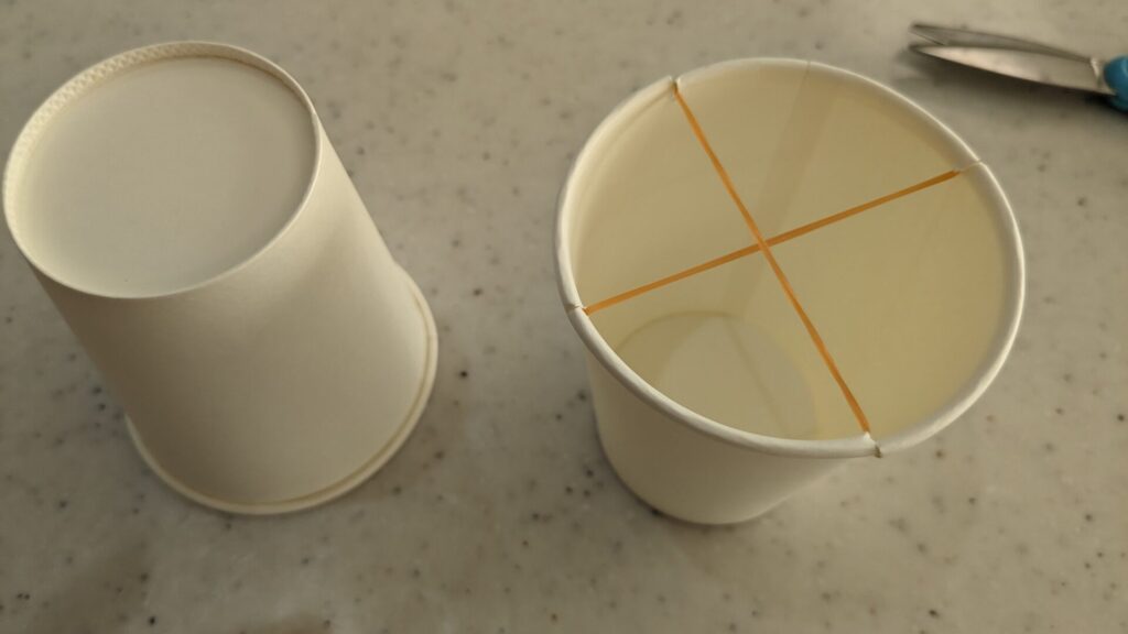 紙コップの1つに4か所切り込みを入れて、輪ゴムをネジって止めます